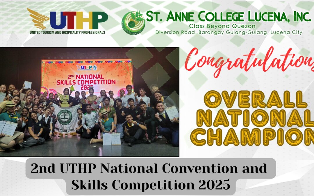 St. Anne College Lucena, Inc. proudly claims the title of OVERALL NATIONAL CHAMPION at the 2nd United Tourism and Hospitality Professionals (UTHP) National Convention and Skills Competition 2025! Once again, SACLI has proven its excellence in tourism, hospitality, and culinary education — showcasing world-class talent, skill, and dedication that go beyond Quezon and beyond expectations!